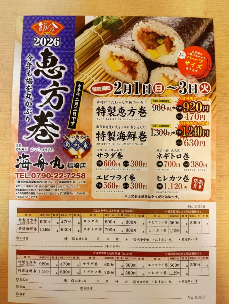 今年の福を海舟丸の恵方巻で、呼び込みましょう。皆様に福がありますよう、従業員一同、巻かせて頂きます!