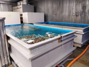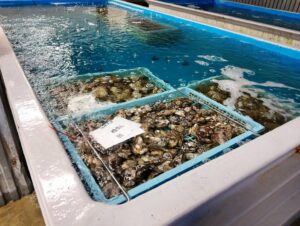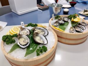 写真は、業者様生け簀と、視察時食べ比べさせていただいた牡蠣たちです。これも美味でした。
