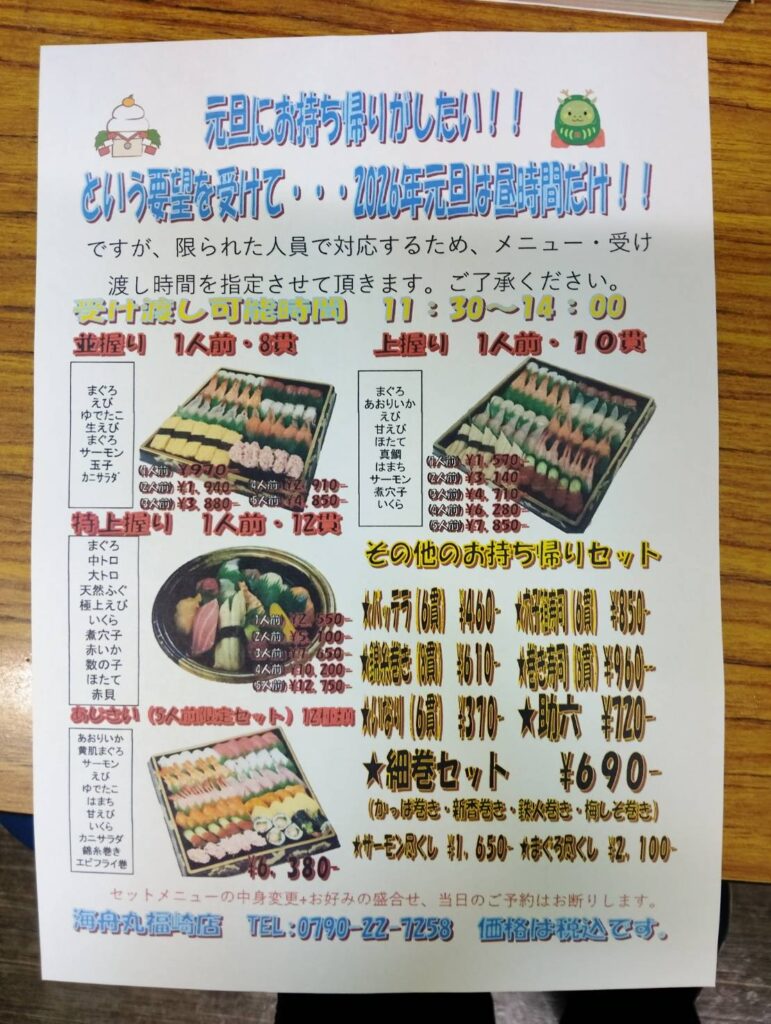 人員が限られているため、時間帯・対応商品に制限はありますが、元旦のご家族の集まりに、当店のお寿司をどうぞ♪