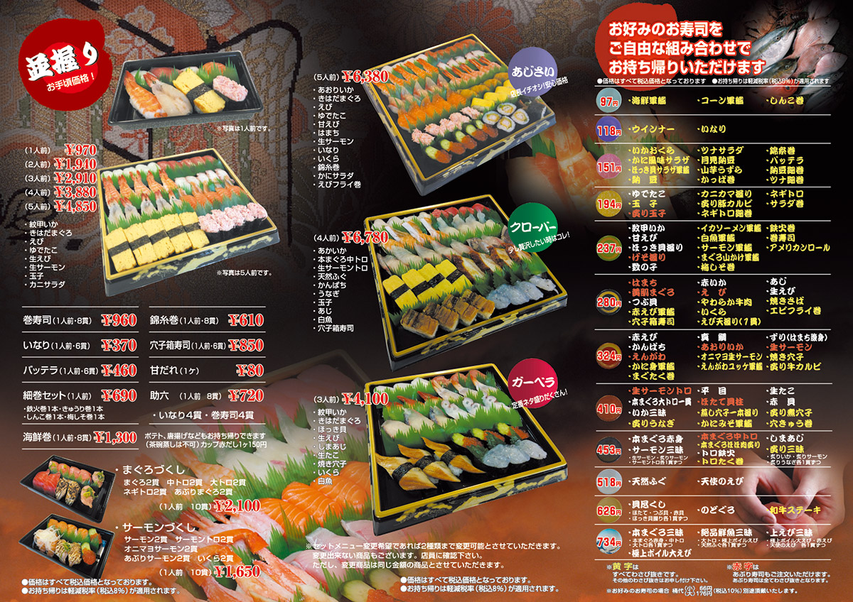 ※季節、天候、市場の状況により、掲載メニューのネタの入荷が無い場合がございます。 ※当日の入荷鮮魚、オススメはお気軽に店舗までお問い合わせください。
